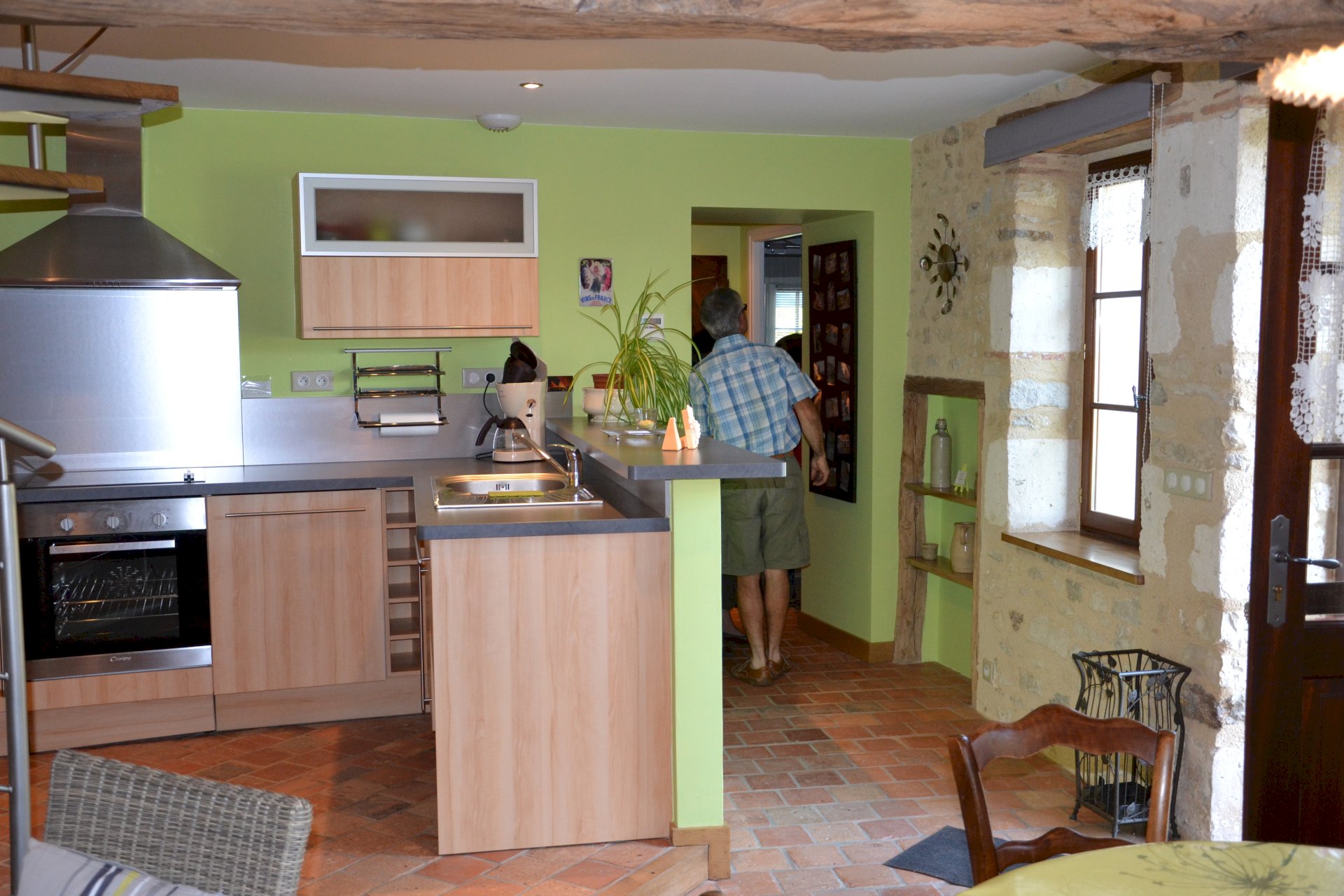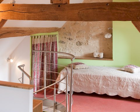 (pierres apparentes, poutres en chêne, tommettes, cheminée et meubles berrichons) au contemporain (cuisine, escalier et salle de bain).